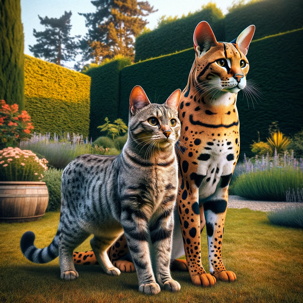 - 사바나캣: 사바나캣은 크기가 매우 큰 편이며, 긴 다리와 큰 귀를 가지고 있습니다. 이들의 털은 비교적 짧으며, 서벌과 유사한 검은색 점박이 무늬가 있습니다. 사바나캣은 그 크기와 길쭉한 몸통으로 인해 더 야생적인 외모를 지니고 있습니다.
